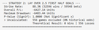 The system has returned a profit on the CGMBet data we tested but for the large levels of liability required, it is a huge risk. There is also a large amount of backfitting here. To reduce the games from 60,000 to 262 is a massive drop. Out of interest, running the test with none of the tight criteria returns a loss of over 6,000 units on the 60,000 games. This with an 88.3% strike rate. This proves that there is a fine line between making a small profit and huge losses.