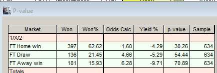 As we can see from the results, even with an odds on favourite who has good home form for the past 3 games, we have a losing strategy. With a p-value of 30.26. Even though this number is closer to 5 than it is to 99, it is still considered as being weak evidence. It is still indistinguishable from just being random luck. As it stands, you can’t have any confidence in this strategy. If this strategy actually had zero edge (was totally random), there is still a 30% probability that we would see results this good (or better) just by chance.