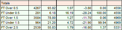 Straight away we can see that the p-values in this strategy are more favourable than the previous strategy. The over 0.5 goals market actually has a p-value of 0, over 1.5 has 0.06 and even the over 2.5 goals strategy only has 1.37. There is no luck involved in this strategy on these markets, yet every one of them is making a loss. Why is this? The markets are super efficient. We have used criteria that proves this. We haven’t been able to uncover an overall edge.