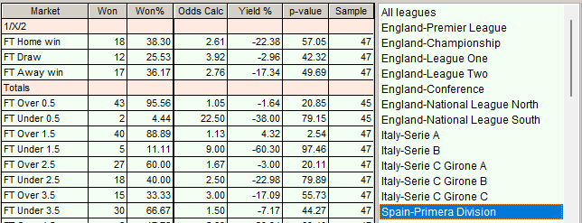It is only when we look at the data league by league that we can find a small edge. If we check out the over 1.5 goals market in Spain’s top league, we get a 4.32% yield. This has a p-value of 2.54. This is a good set of criteria to use on this league. The sample size is still very small but as it stands we are beating the book by using skill rather than luck.